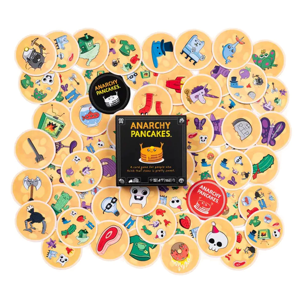 No rápido jogo de combinação Anarchy Pancakes, cada jogador começa com sete cartas de panqueca que apresentam várias coberturas desajustadas, como uma minhoca, um donut em chamas e uma caveira com um chapéu de festa.